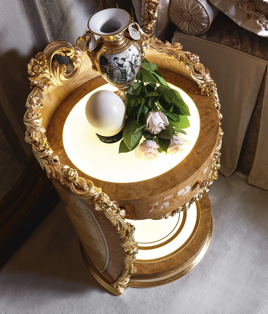 Briar woods of Ash, Myrtle and Maple in their natural color draw a floral ballade with blossoms made of Mother-of-Pearl in a captivating inlaid frieze that celebrates the rich gardens of ‘700 Italiano.
